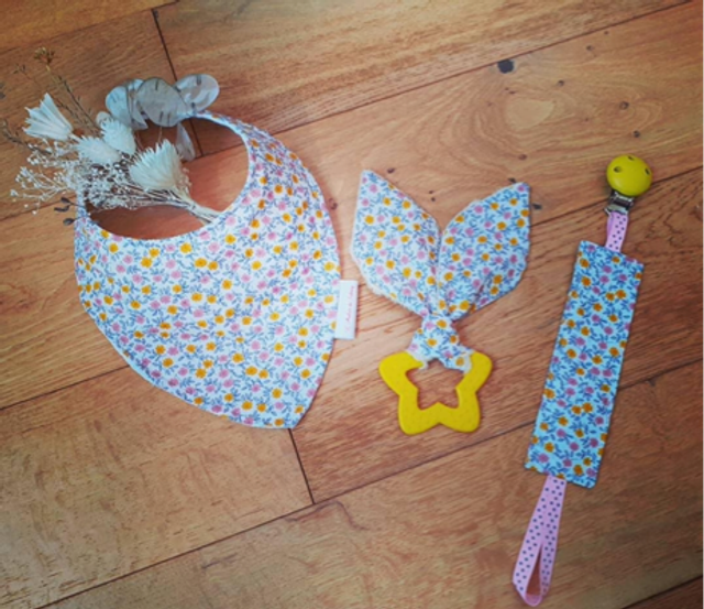 Le bavoir possède une face en Liberty, une autre face absorbante en nid d'abeille et a l'intérieur un revêtement imperméable.
